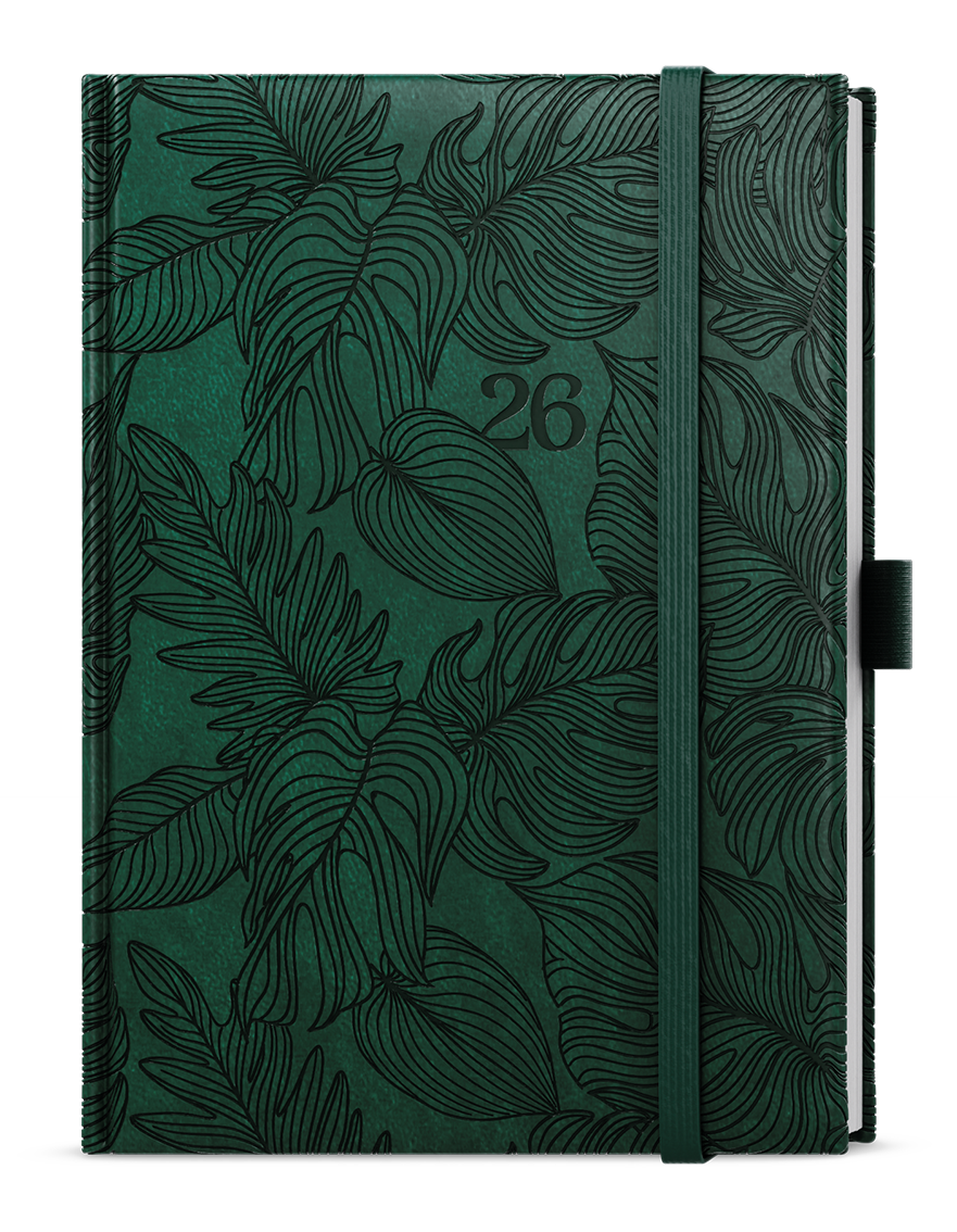 jemný hladký materiál, celoplošná ražba motivu včetně ražby roku, šitá vazba V8, stužka, gumička, poutko na propisku, perforované rožky, vlepená kapsa, ofset, 70g/m2