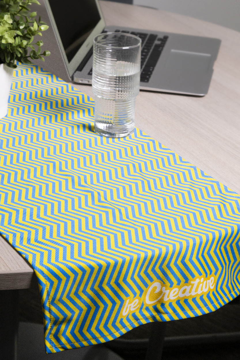 Běhoun na stůl vyrobený na zakázku z mikrovlákna RPET (170 g/m²) s celoplošným sublimačním potiskem, cena nezahrnuje tiskovou přípravu. Min. mn.: 25 ks.