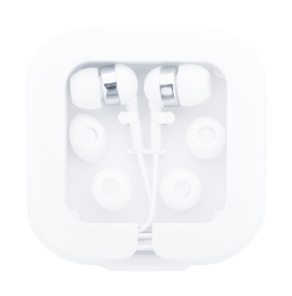 Sluchátka do uší s digitálním připojením USB-C a 3 páry špuntů v plastovém pouzdře s funkcí stojánku na mobil.