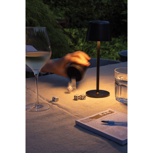 Dobíjecí a přenosná stolní lampa. Vyrobeno z RCS certifikovaného recyklovaného ABS a kovové tyče. RCS certifikace zajišťuje garanci použití recyklovaného materiálu díky transparentnímu přehledu nad dodavatelským řetězcem. Celkový podíl recyklátu dle váhy produktu: 51 %. Stolní lampa funguje na jedno nabití až 8 hodin a lze ji znovu nabít během 3 hodin. Lampa disponuje 3 světelnými režimy (teplé světlo, bílé světlo a neutrální), který lze upravit dotykem na horní část lampy. Dobíjení přes USB-C, součástí je 80 cm nabíjecí kabel z recyklovaného TPE. Baleno v papírovém obalu.