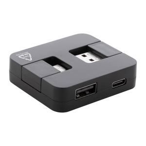 USB hub vyrobený z recyklovaného ABS plastu se 2 USB a 2 USB-C porty. Se sklopnými konektory USB a USB-C. USB 2.0.