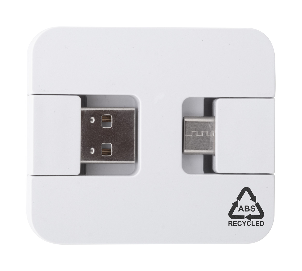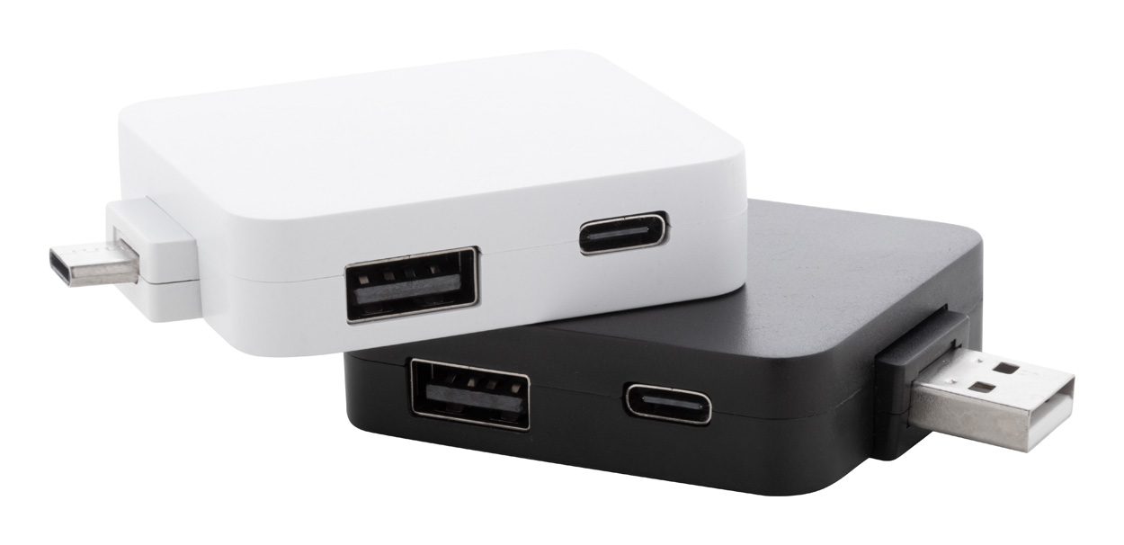 USB hub vyrobený z recyklovaného ABS plastu se 2 USB a 2 USB-C porty. Se sklopnými konektory USB a USB-C. USB 2.0.
