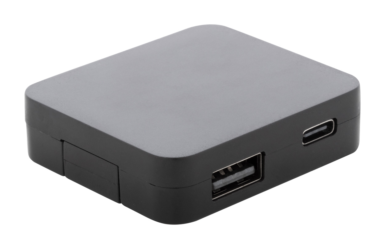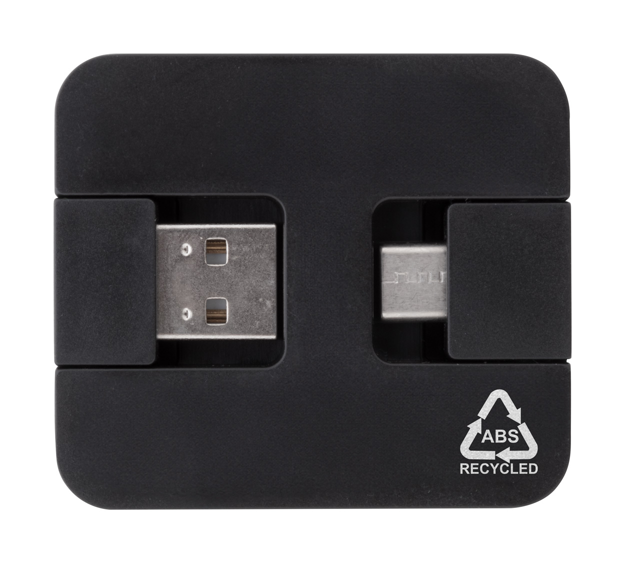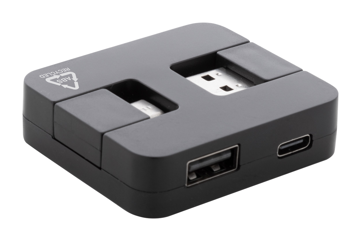 USB hub vyrobený z recyklovaného ABS plastu se 2 USB a 2 USB-C porty. Se sklopnými konektory USB a USB-C. USB 2.0.