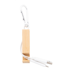 USB nabíjecí kabel s karabinou z recyklovaného hliníku a bambusovým držákem na mobil. S konektory micro USB, USB-C a Lightning. Se vstupy USB a USB-C.