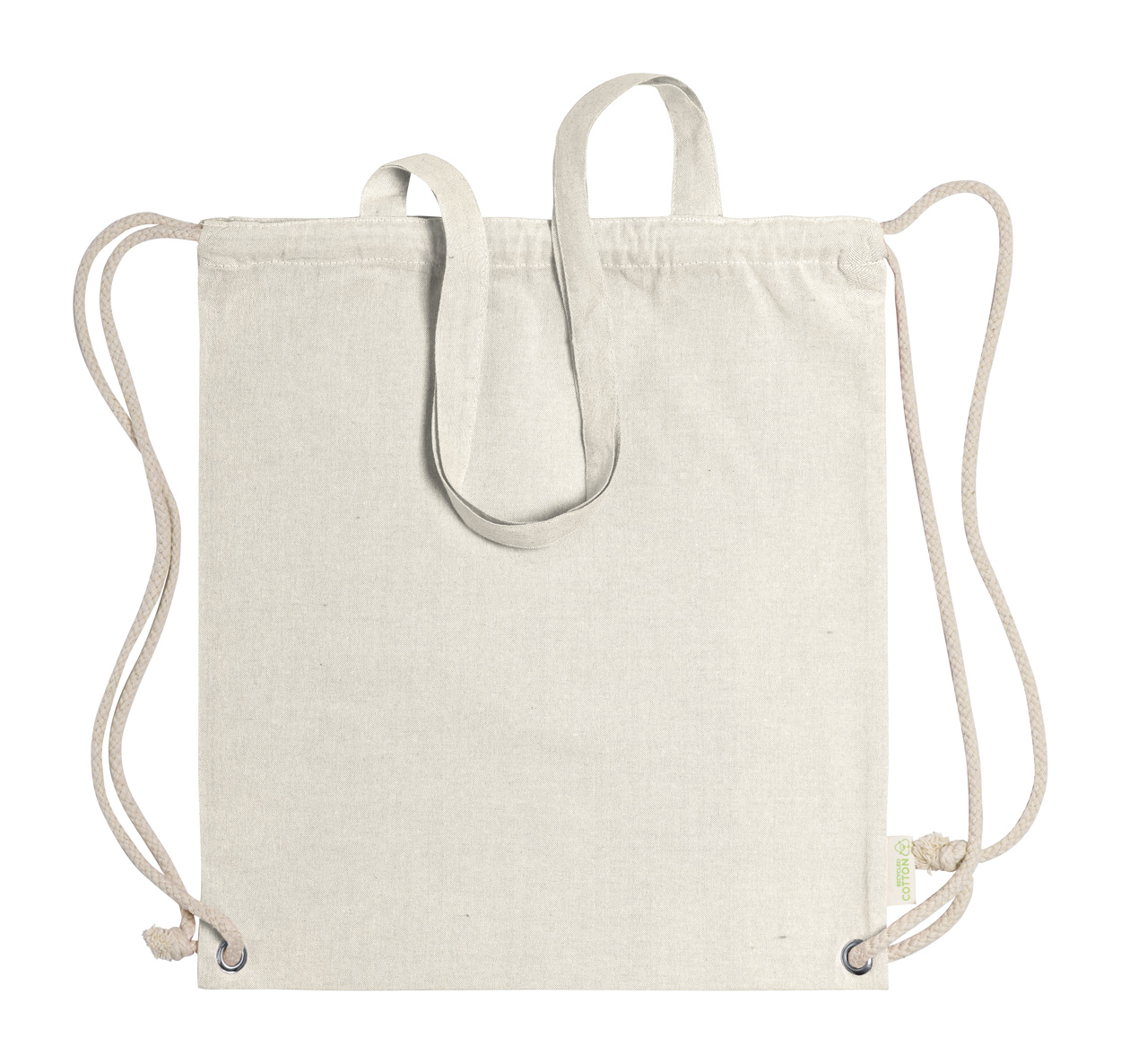Vak na stahování šňůrkou z recyklované bavlny se silnými pletenými šňůrami a dlouhými uchy. Lze jej také použít jako nákupní tašku. 100% recyklovaná bavlna, 140 g/m².