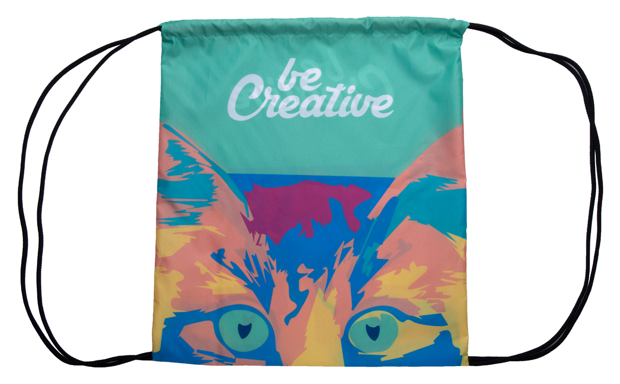 Vak na stažení na zakázku s barevnými šňůrkami, 190T polyester. Cena zahrnuje celoplošný sublimační potisk, nezahrnuje tiskovou přípravu. Min. mn.: 50 ks.