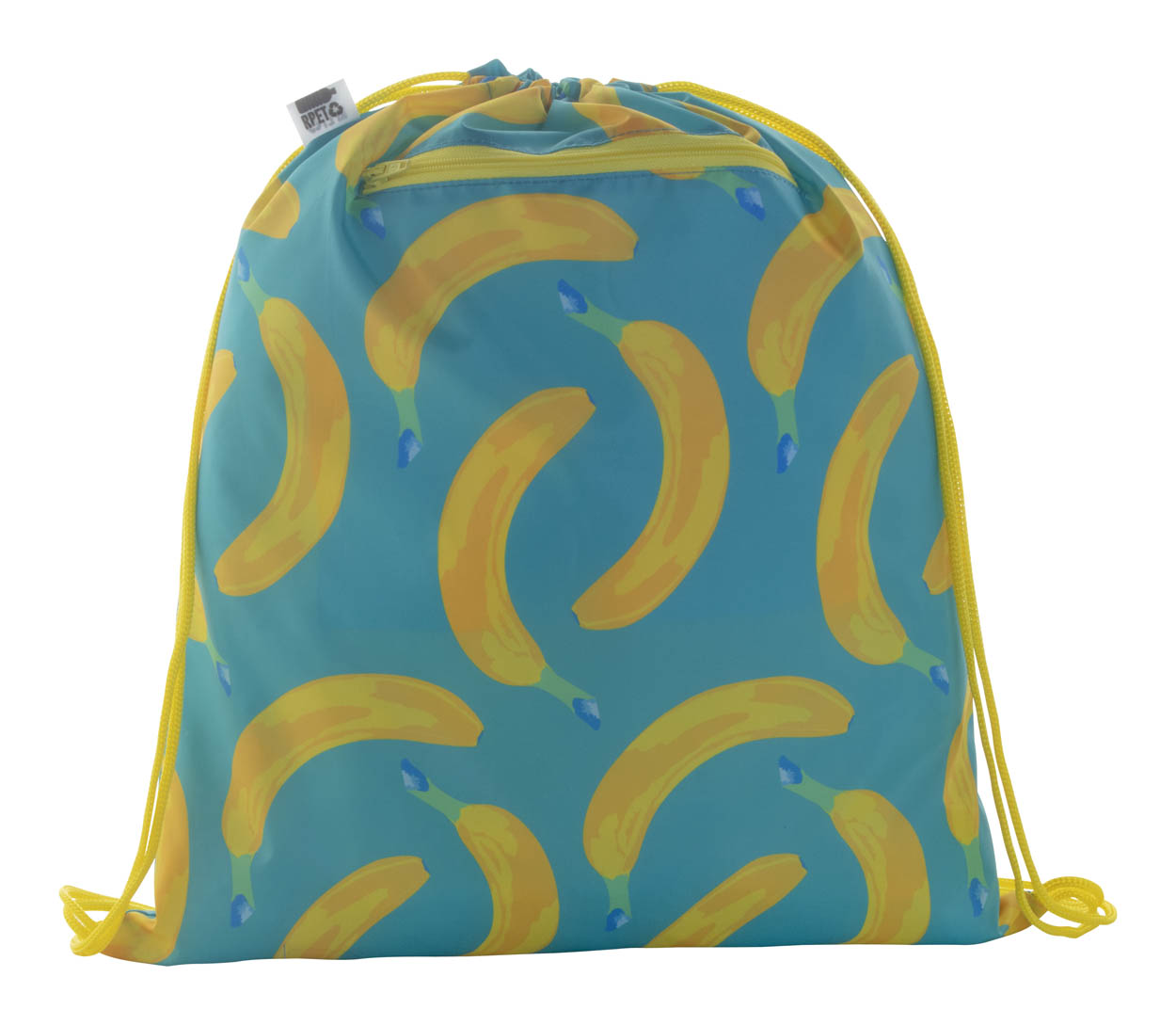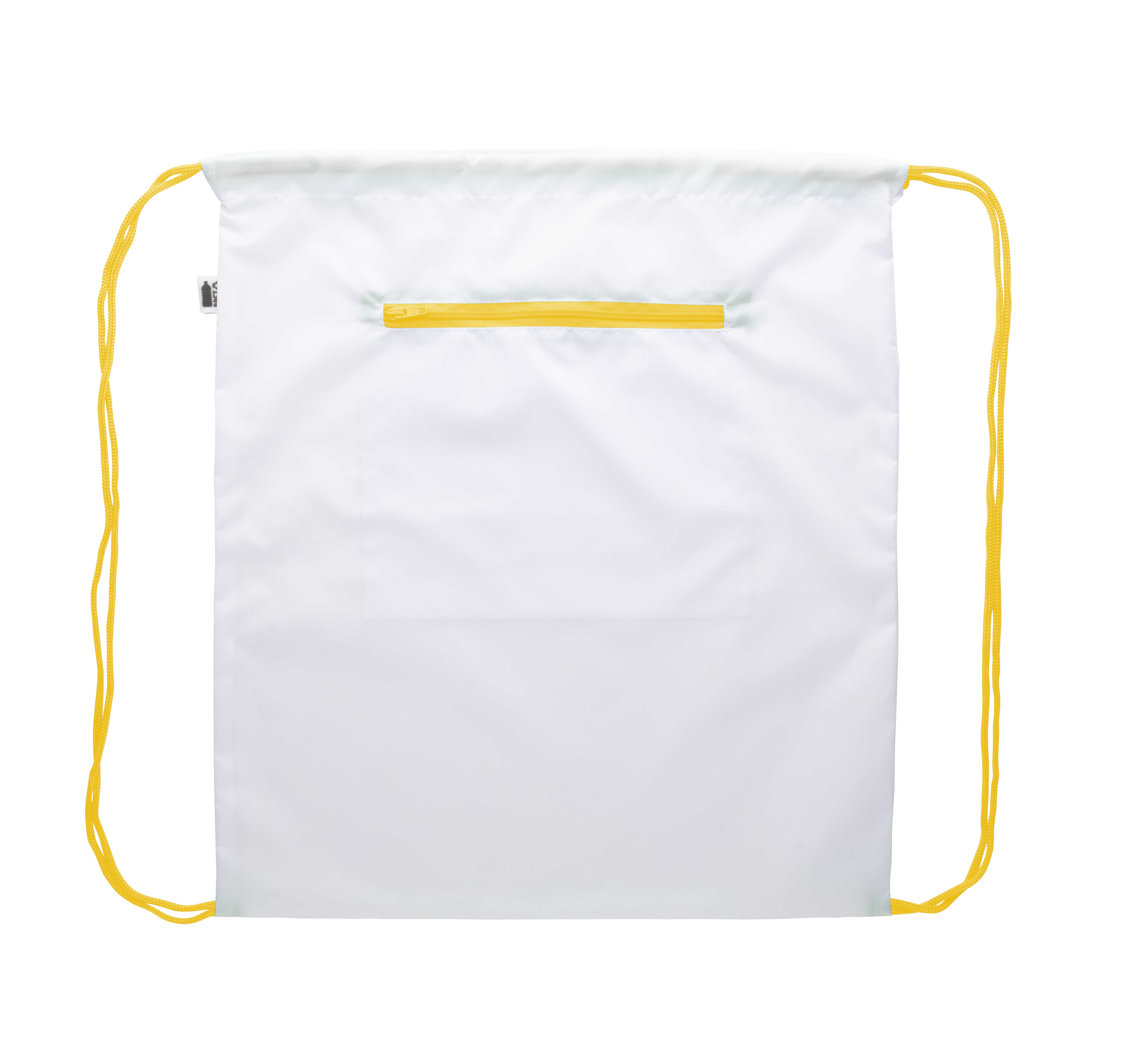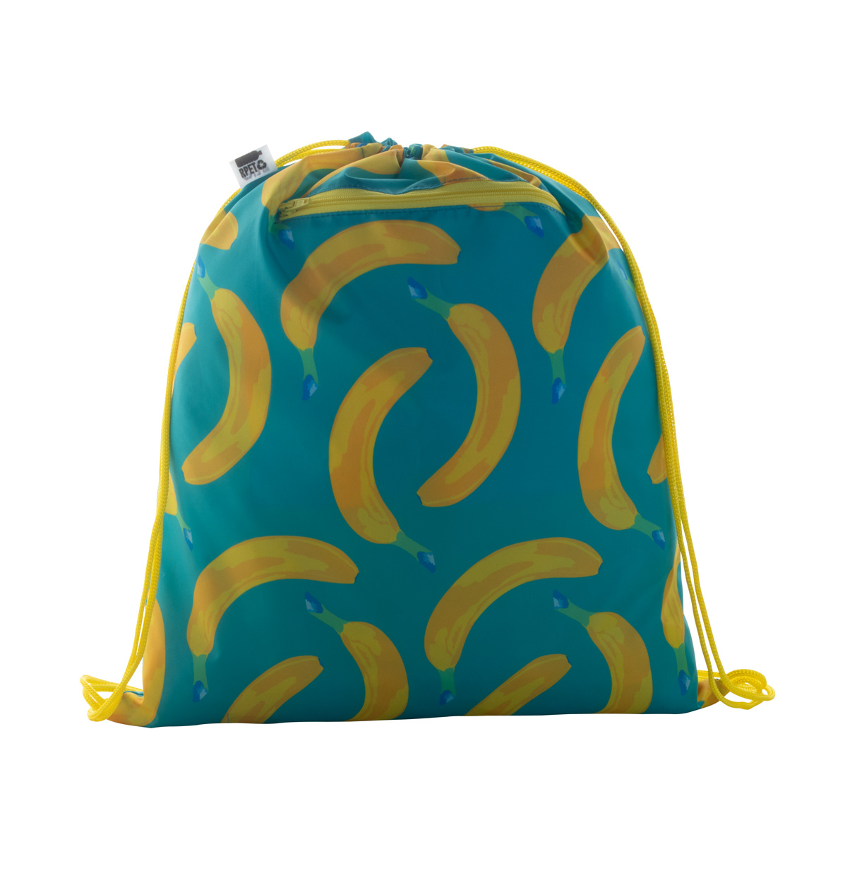 Vak na stahování šňůrkou na zakázku s přední kapsou na zip, 190T RPET polyester, s etiketou s označením RPET. S celoplošně tištěnou grafikou sublimací. Cena zahrnuje sublimační tisk, nezahrnuje tiskovou přípravu. Min. mn.: 50 ks.