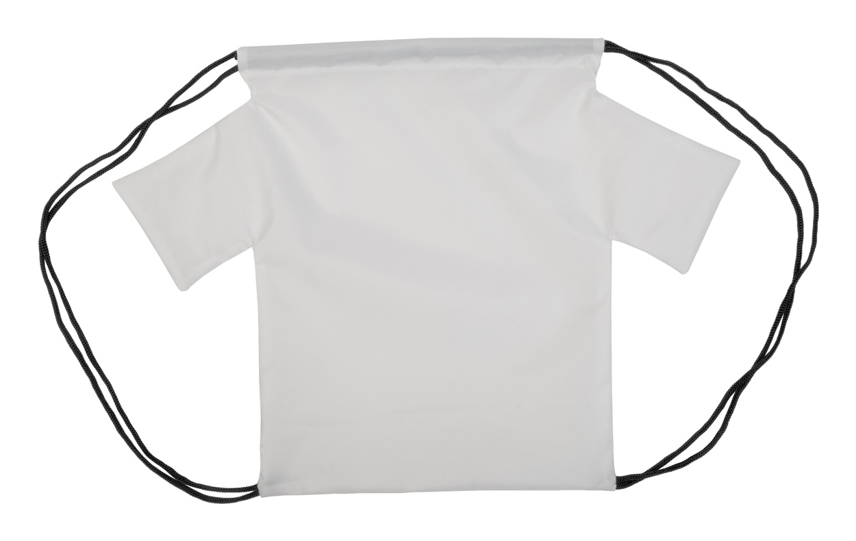 Na zakázku vyrobený vak na stažení šňůrkou ve tvaru trička s barevnými šňůrkami, 190T polyester. S celoplošnou sublimační tištěnou grafikou, cena nezahrnuje tiskovou přípravu. Min. mn.: 50 ks.