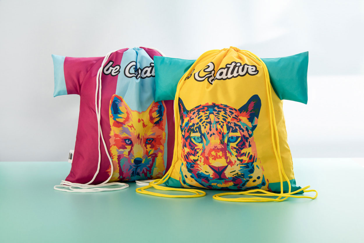 Na zakázku vyrobený vak na stažení šňůrkou ve tvaru trička s barevnými šňůrkami, 190T RPET polyester. S celoplošnou sublimační tištěnou grafikou, cena nezahrnuje tiskovou přípravu. Min. mn.: 50 ks.