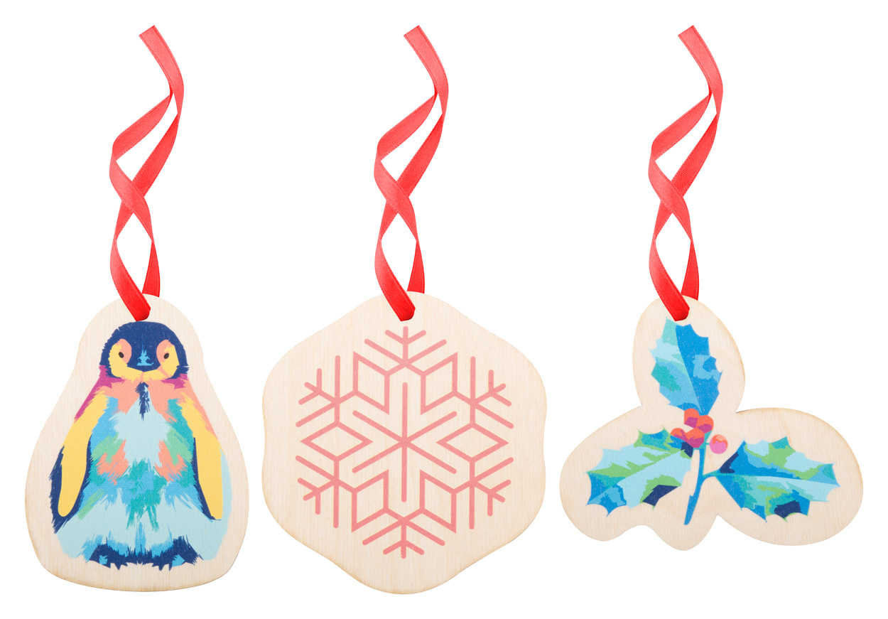 Zakázková ozdoba na vánoční stromeček z březové překližky s vlastním tvarem a plnobarevnou grafikou. Maximální rozměr: 80x80 mm. Cena je včetně UV LED tisku na jedné straně, nazahrnuje tiskovou přípravu. Dodáváno se stuhou zvlášť. Min. mn.: 100 ks.