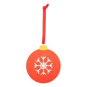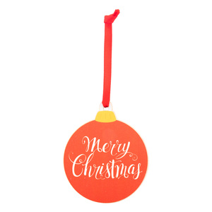 Vánoční ozdoba z březové překližky, s tištěným vánočním designem a červenou stužkou, která je dodávána zvlášť.