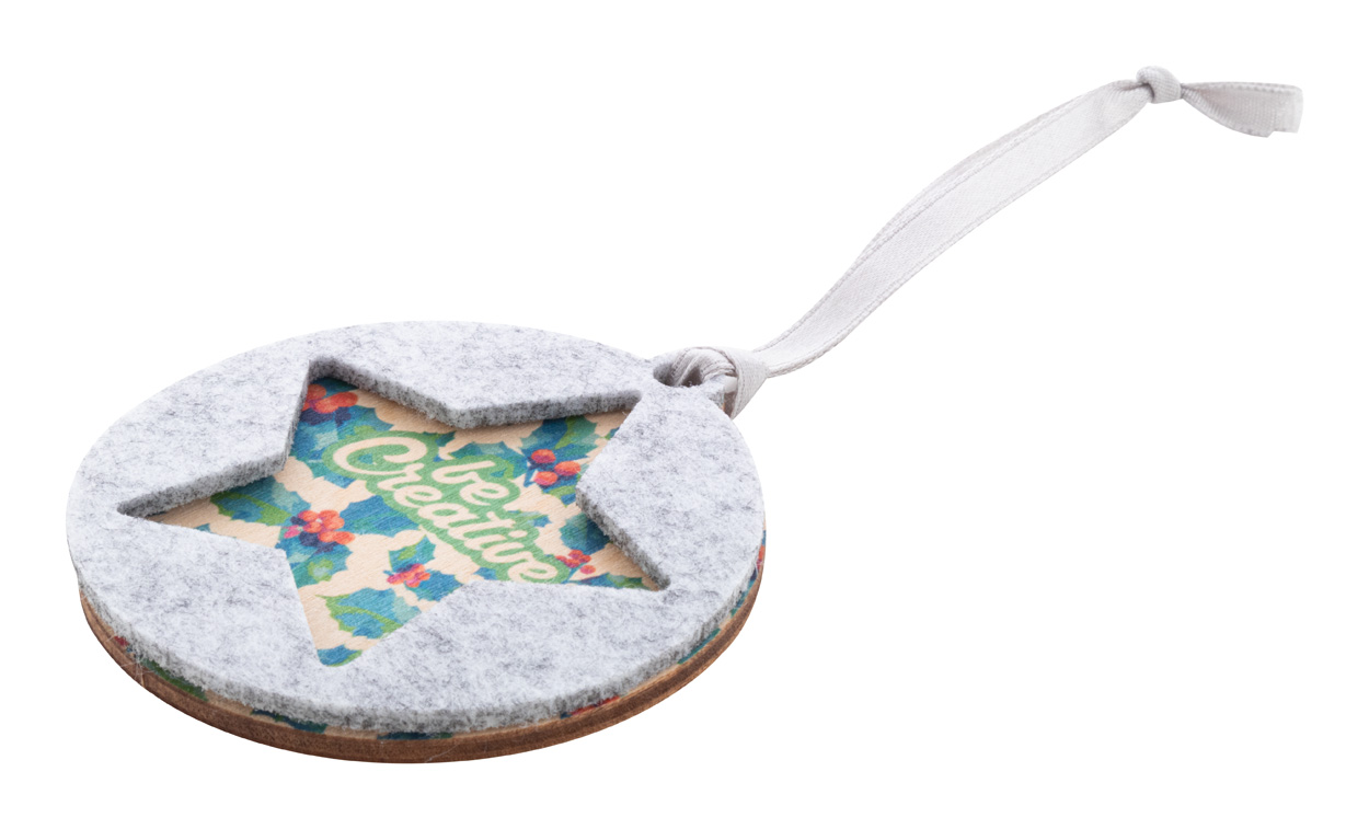 Ozdoba na vánoční stromeček z dvouvrstvé RPET plsti a březové překližky vyrobená na zakázku s celostříbrnou stuhou a vysekávaným vánočním designem na horní vrstvě. Cena zahrnuje UV LED potisk na spodní vrstvě, nezahrnuje tiskovou přípravu. Min. mn.: 100 ks.