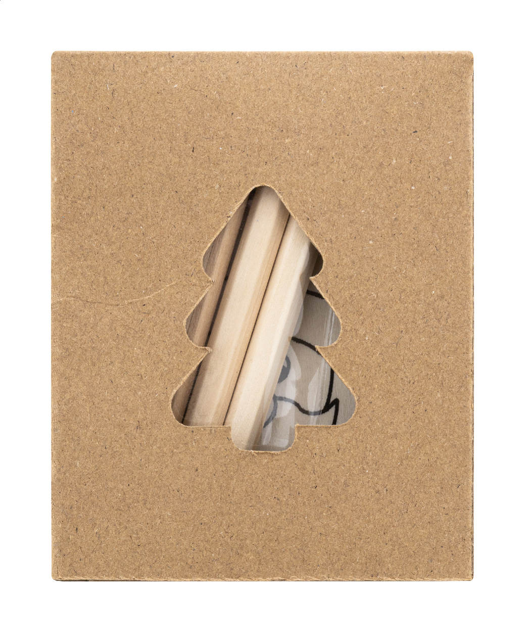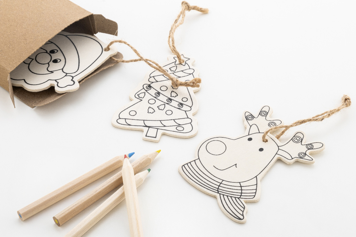 Sada vánočních ozdob na vybarvení v krabičce z kraftového papíru s vyřezávaným vánočním stromečkem. Včetně 3 dřevěných ozdob s konopnou šňůrou a 4 barevných tužek.