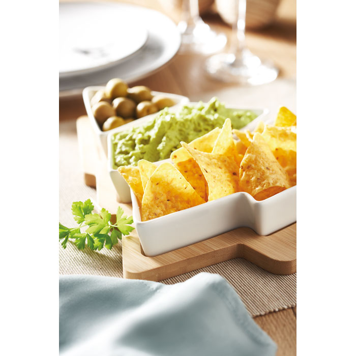 Bambusový servírovací podnos ve tvaru stromečku a třemi keramickými servírovacími miskami. Bambus je přírodní materiál, může dojít k mírným změnám barvy, dekorace a velikosti.