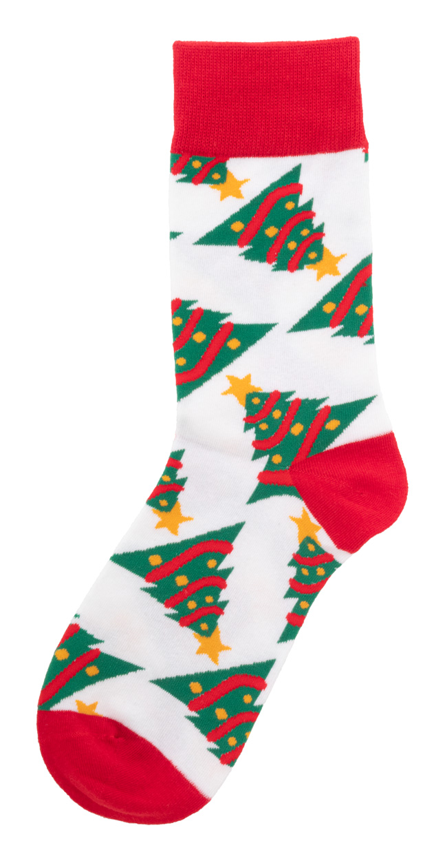 Pár vánočních ponožek ze 73 % bavlny, 25 % RPET polyesteru a 2 % spandexu. S potisknutelným sulfátovým papírem.