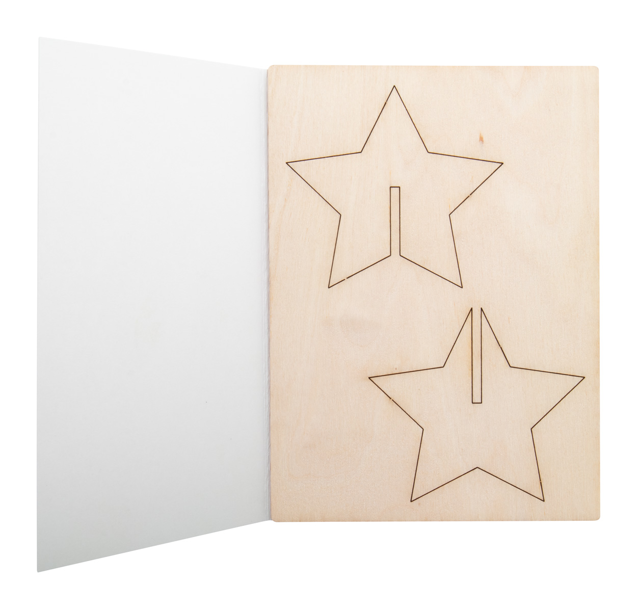 Vánoční přání na zakázku z papíru s grafikou na obou stranách a dřevěným vánočním motivem na sestavení. Vč. C6 poštovní obálky. Min. mn.: 100 ks.