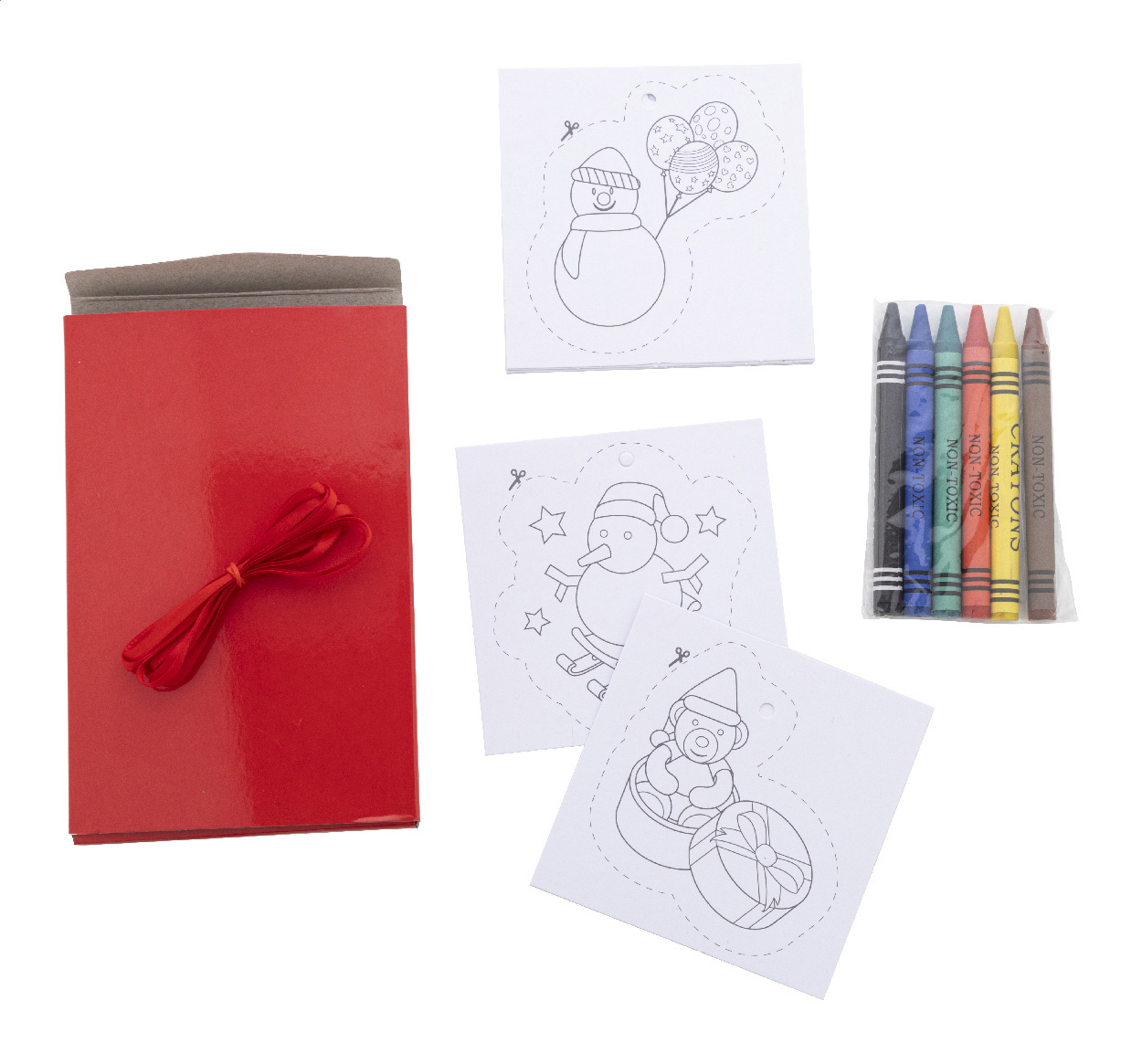 8dílná vánoční omalovánka s papírovými ozdobami, včetně 6 voskovek a závěsných stuh. V červené papírové krabičce.