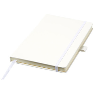 Poznámkový blok s imitací kůže A5 (14,2 cm x 21,4 cm) (koženka) s elastickým páskem, záložkou, smyčkou na pero a skládací zadní kapsou. Obsahuje 96 listů řádkovaných krémových papírů o hmotnosti 70 g/m2 a je nabízen v bílém pouzdru Journalbook.