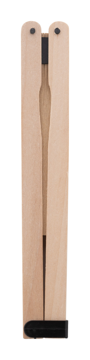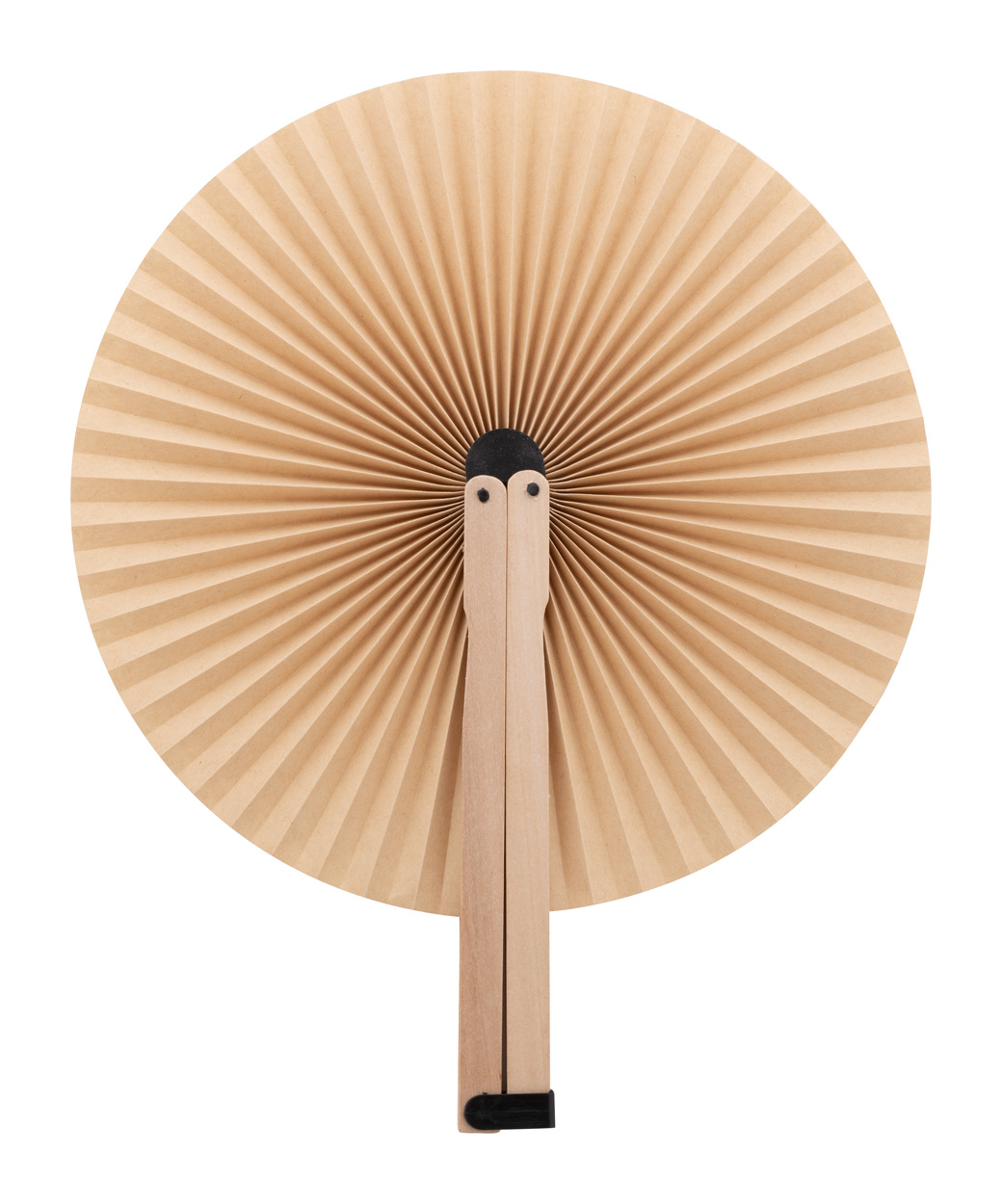 Vějíř z kraftového papíru s dřevěnou rukojetí.
