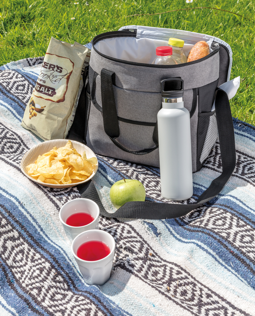 Velká chladící taška schopná uchovat až 20 plechovek. Dvě postranní síťové kapsy a jedna přední kapsa. Vyrobeno z polyesteru 600D.