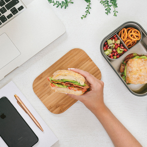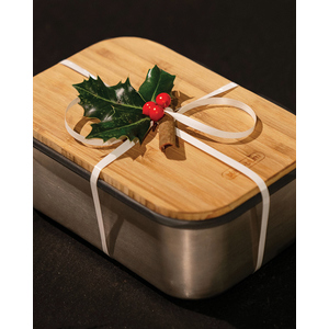 Na základě úspěchu naší první krabičky na jídlo jsme představili tuto hlubší verzi, která umožňnuje uchování dalších potravin jako jsou ovoce nebo jogurty. Jedná se o robustní designové řešení 100% bez plastů pro přípravu a přenášení potravin. Přirozeně antibakteriální bambusové víko lze využít jako prkénko na krájení nebo jako servírovací prkénko. Krabička z nerezové oceli chrání obsah a silikonový pásek poskytuje větší bezpečnost. Vnitřní přihrádka pro oddělení potravin. Je vhodná do mikrovlnné trouby. Pouze ruční mytí.