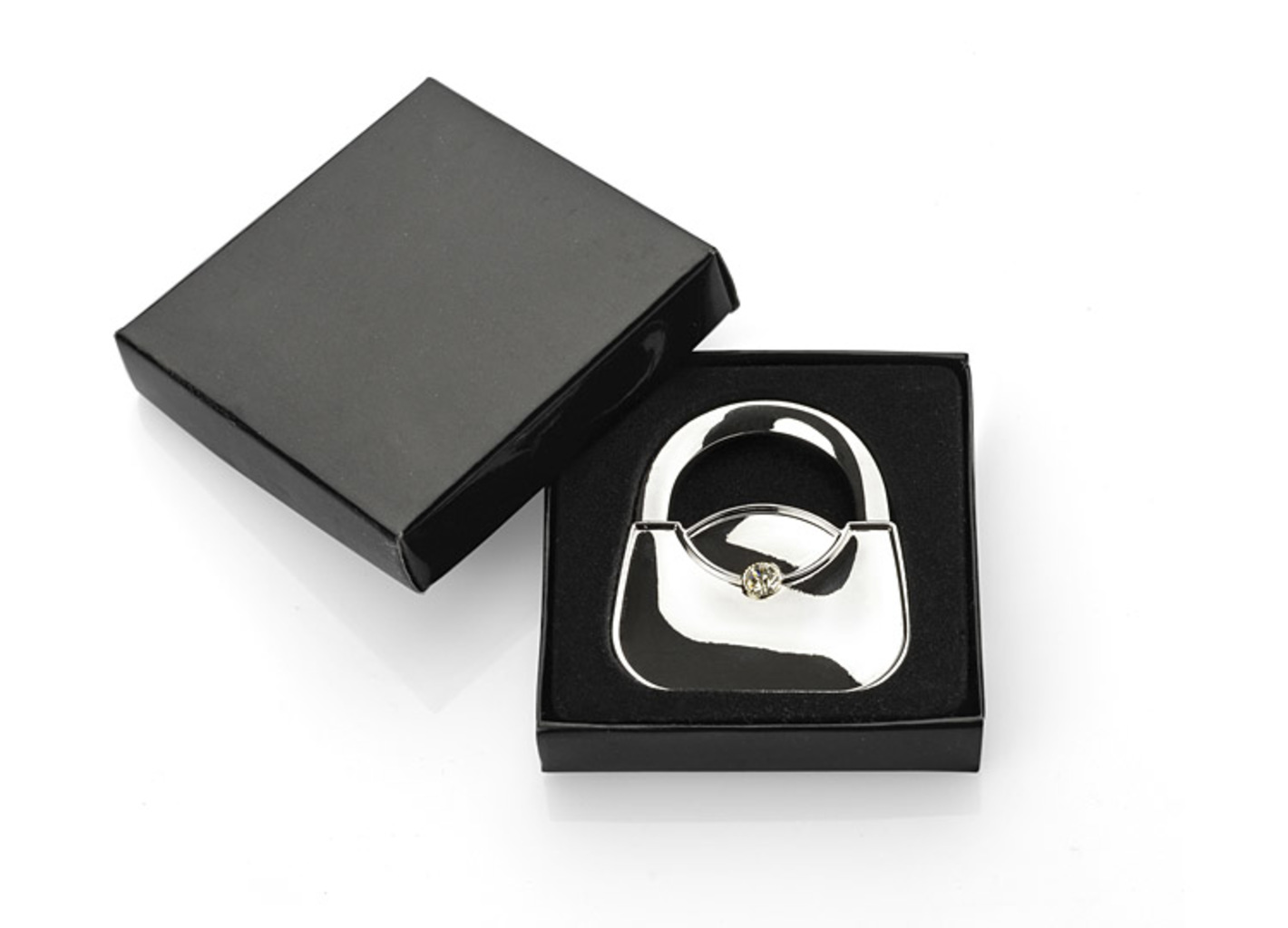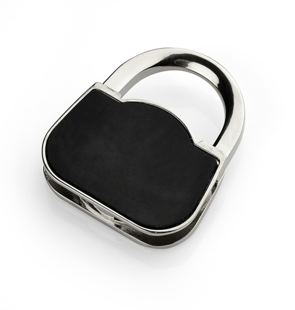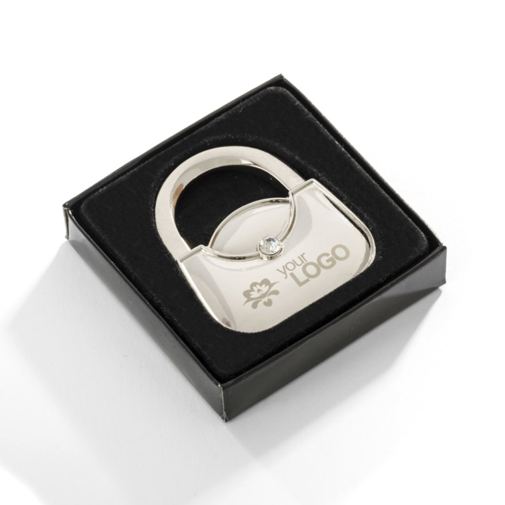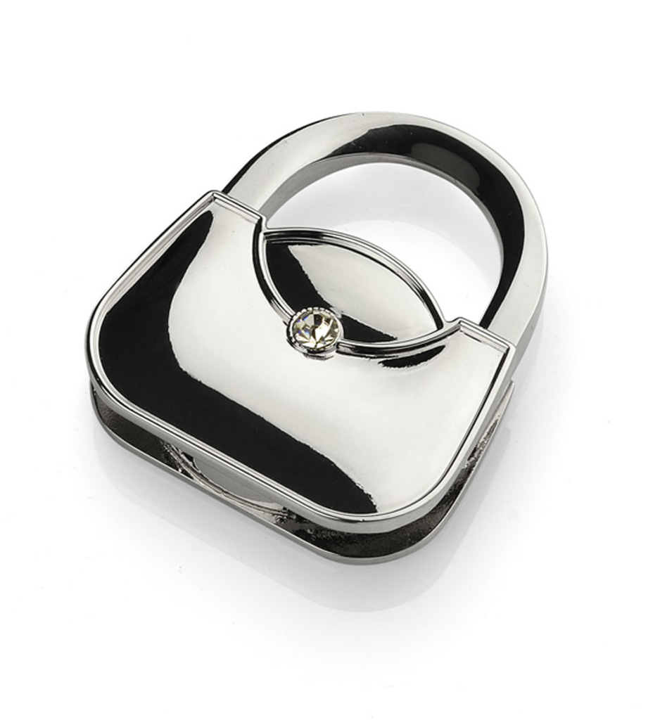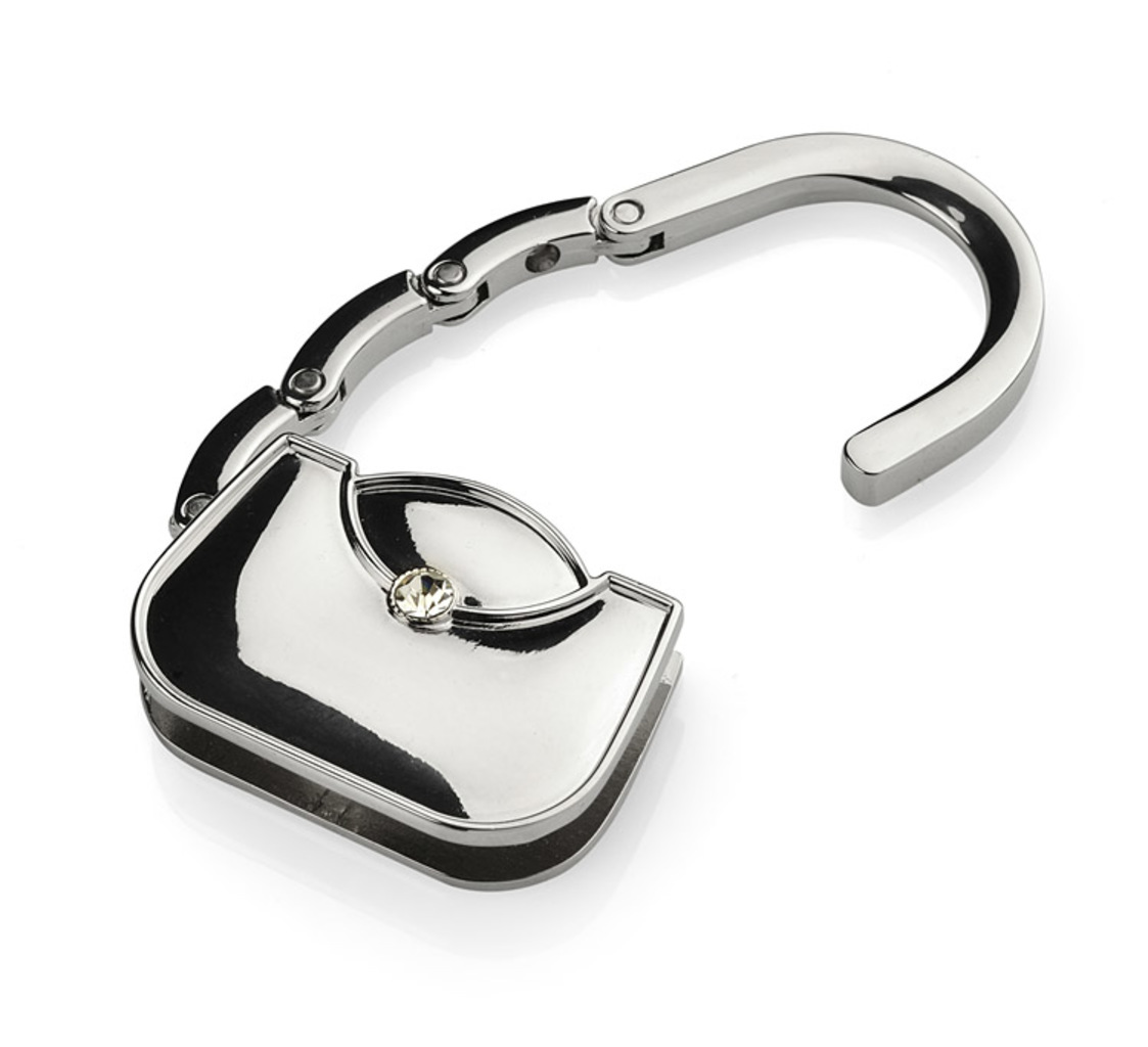 Skládací, taška ve tvaru tašky vyrobená z kovu. Tento taška hanger je ozdoben elegantním sklem. Produkt je balen v černé krabici. Logo může být vyryto na produkt.