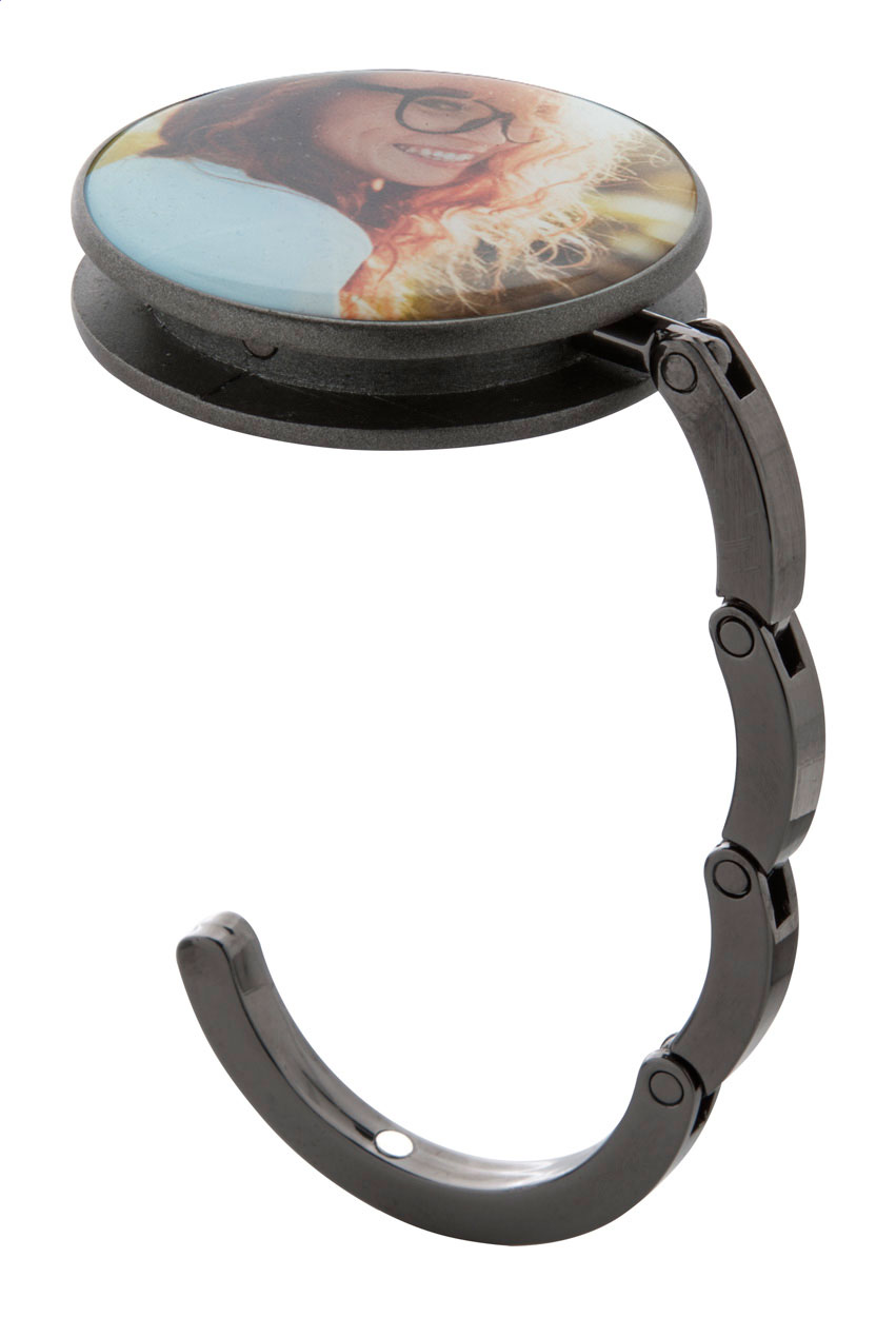 Kovový věšáček na tašku v barvě gun metal s lesklým povrchem. Magnetické zavírání.
