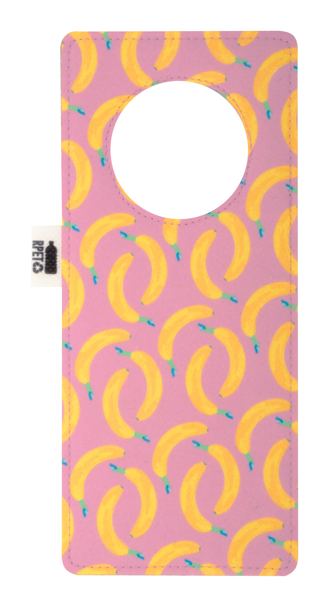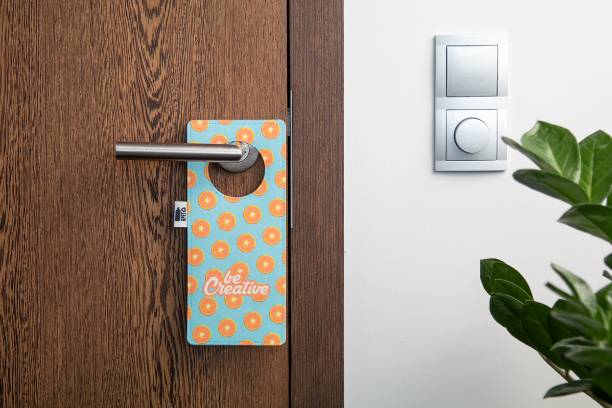 Na zakázku vyrobený věšák na dveře z RPET plsti s celobarevně potištěnou přední stranou a výrazným štítkem RPET. Cena včetně sublimačního tisku. MOQ: 50 ks