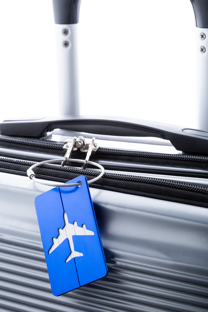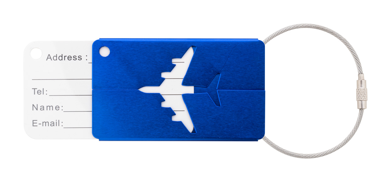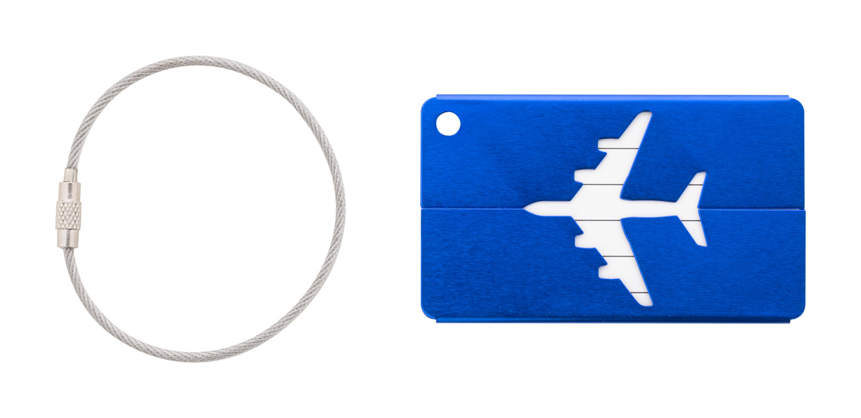 Hliníková visačka na zavazadla s motivem letadla a kovovým lankem.