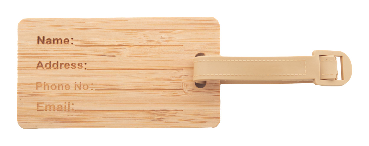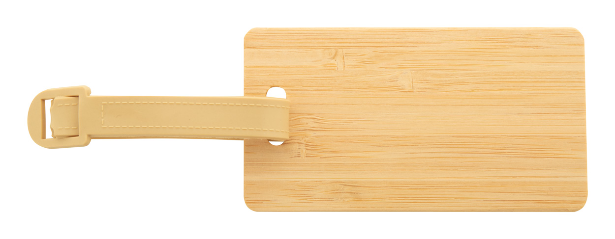 Bambusová visačka na zavazadla s plastovým páskem a přezkou.