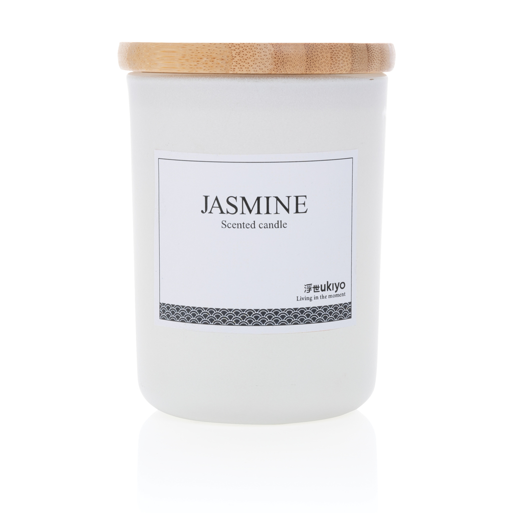 Prémiová vonná svíčka Ukiyo pro příjemné provonění domova a navození útulné atmosféry. Svíčka je v elegantní sklenici s bambusovým víkem. Jasmínová vůně.