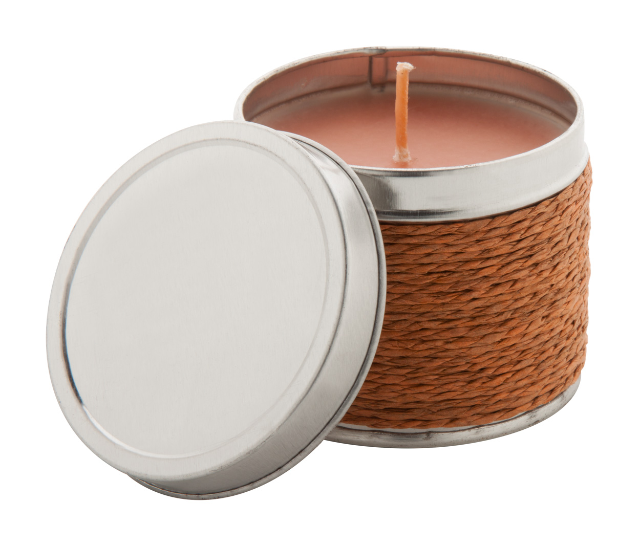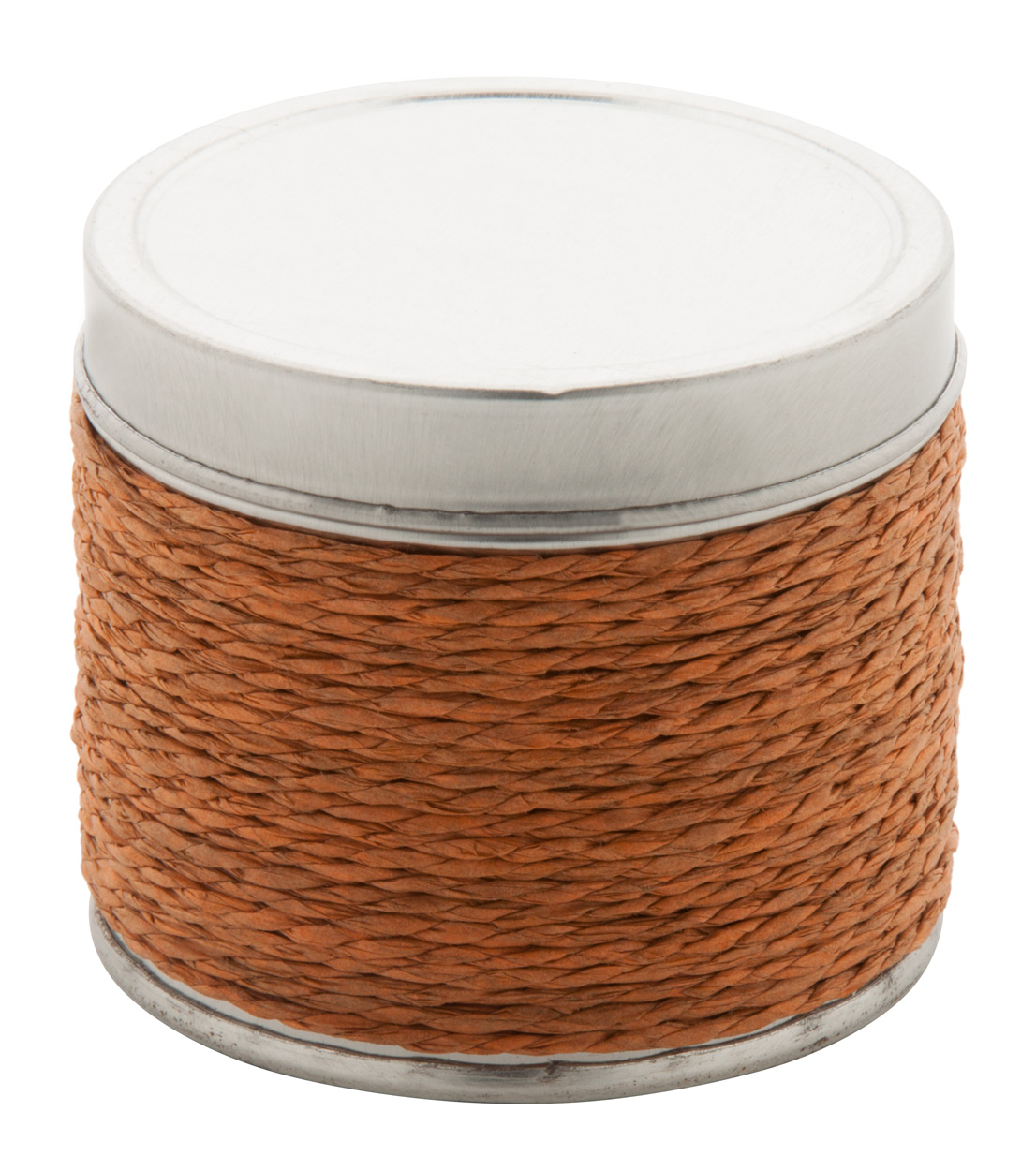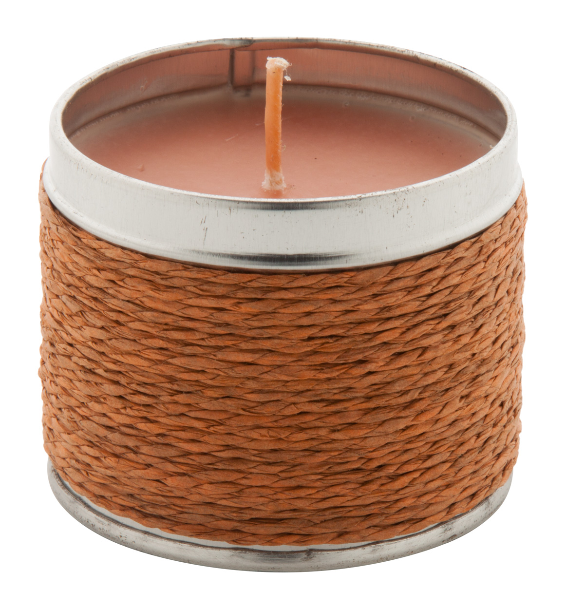 Vonná svíčka v kovové krabičce omotané provázkem.