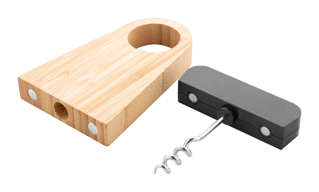 Bambusový a recyklovaný ABS držák na víno s vývrtkou z nerezové oceli.