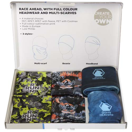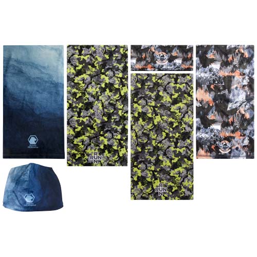 Vzorkovnice s pokrývkami hlavy se sublimačním potiskem se 4 víceúčelovými šátky, 1 čelenkou s technologií Coolmax a 1 fleecovou čepicí. Vyrobeno v Evropě.