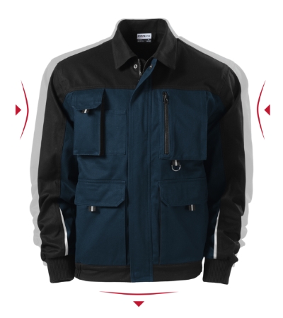 celopropínací kostěný zip s klopou, záhyby na zadním dílu, 8 multifunkčních kapes, měchové kapsy s klopou a lištové kapsy na zip, manžety rukávů z žebrového úpletu s 3 % elastanu, dolní okraj stažený pruženkou v boční části, kovové "D" poutko na klíče a ID karty, dvojité prošití pro vyšší odolnost, retroreflexní prvky