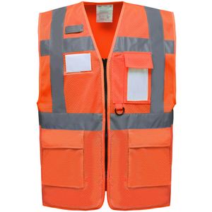 Prodyšný materiál, plný zip, 2 boční kapsy s klopami, kapsa na doklady, různé funkční kapsy, našitá náprsní kapsa, integrovaný držák na pero, kroužek k připevnění karty, klíčů, atd., lehký materiál, certifikováno podle EN ISO 20471 třída 1 a 2, garantované reflexní vlastnosti podle EN - normy pro 25 praní, 1 reflexní pruh přes každé rameno, dva reflexní pruhy široké 5 cm kolem těla, pratelné na 40°