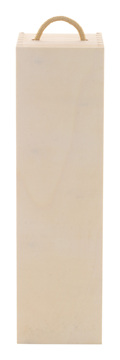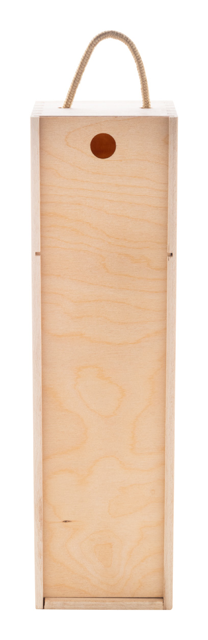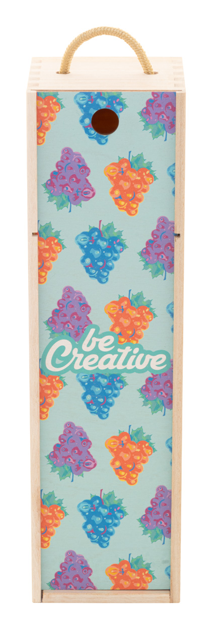 Dřevěná dárková krabička na víno na zakázku se šňůrovou rukojetí a plnobarevně potištěným víkem. Cena včetně UV LED tisku, nezahrnuje tiskovou přípravu. Min. mn.: 50 ks.