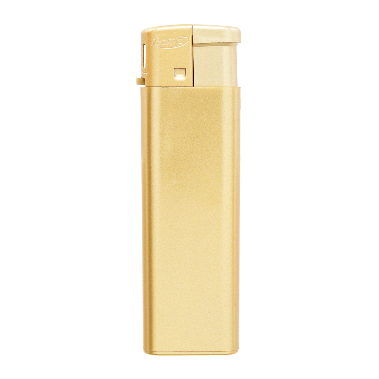 Plnitelný plastový piezo zapalovač v metalické barvě. Dětská pojistka. Dodáváno s cca. 80% hladiny plynu. K dispozici pouze v plném exportním kartonovém množství (násobky 1 000 ks)!