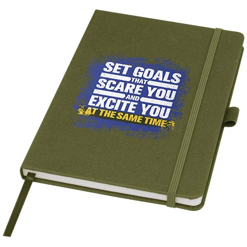Zápisník formátu A5 s obálkou z látky s RPET. Obsahuje 80 listů linkovaného recyklovaného papíru 70 g/m2 se stuhovou záložkou a očkem na pero. Lze kombinovat s kuličkovým perem z RPET Honua 107757.