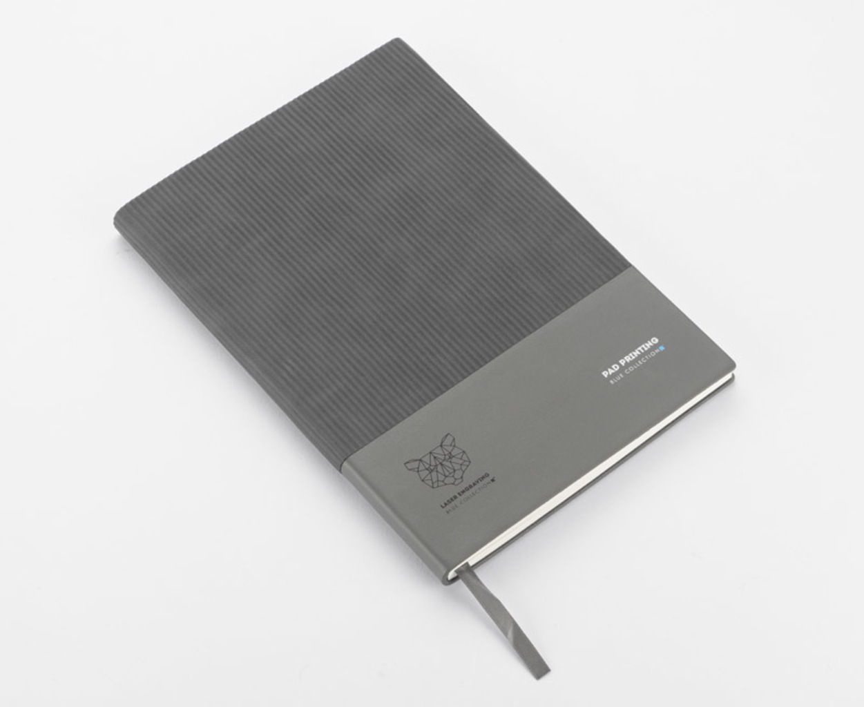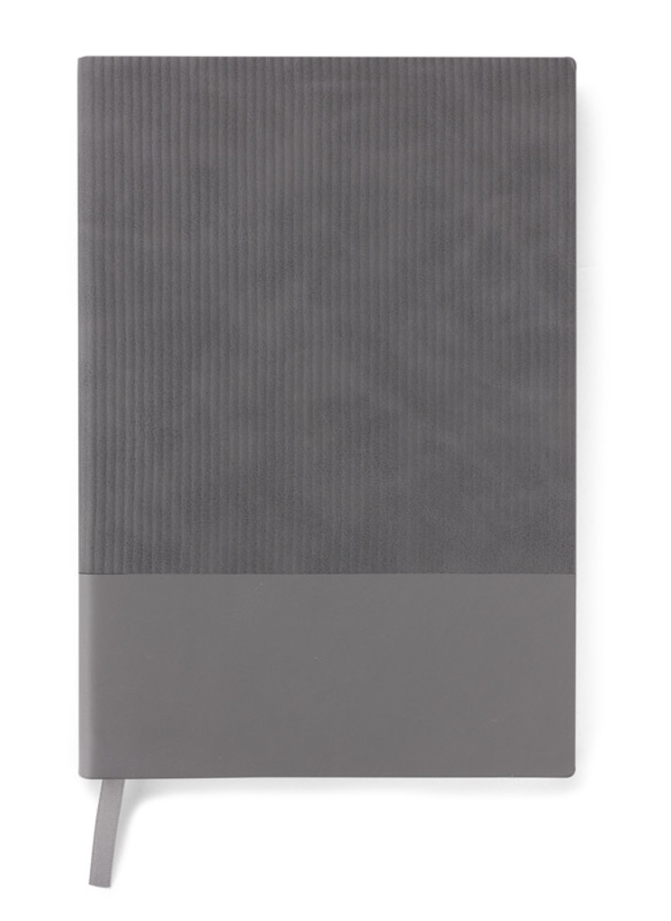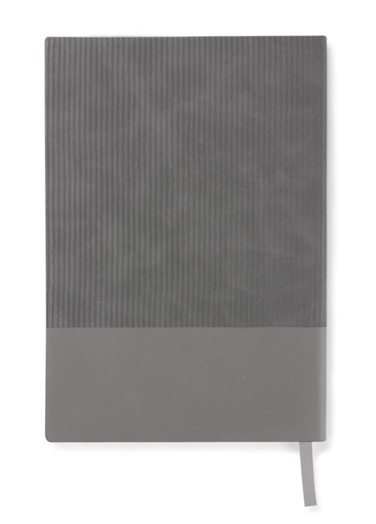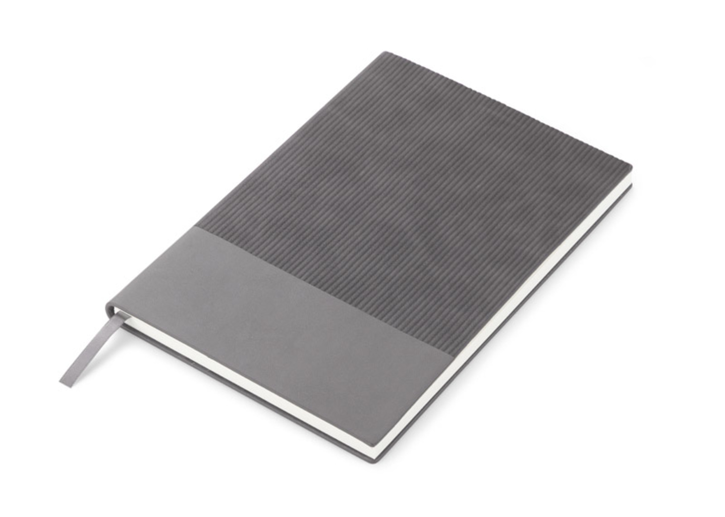 Zápisník FLAF ve formátu A5 má měkkou obálku kombinující materiál podobný kůži (PU) a látku připomínající manšestr, která mu dodává příjemnou textilní strukturu. Uvnitř obsahuje 80 tečkovaných stránek a praktickou látkovou záložku