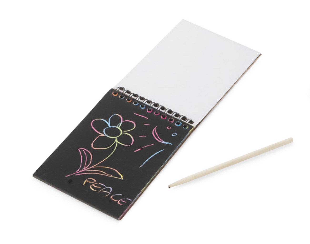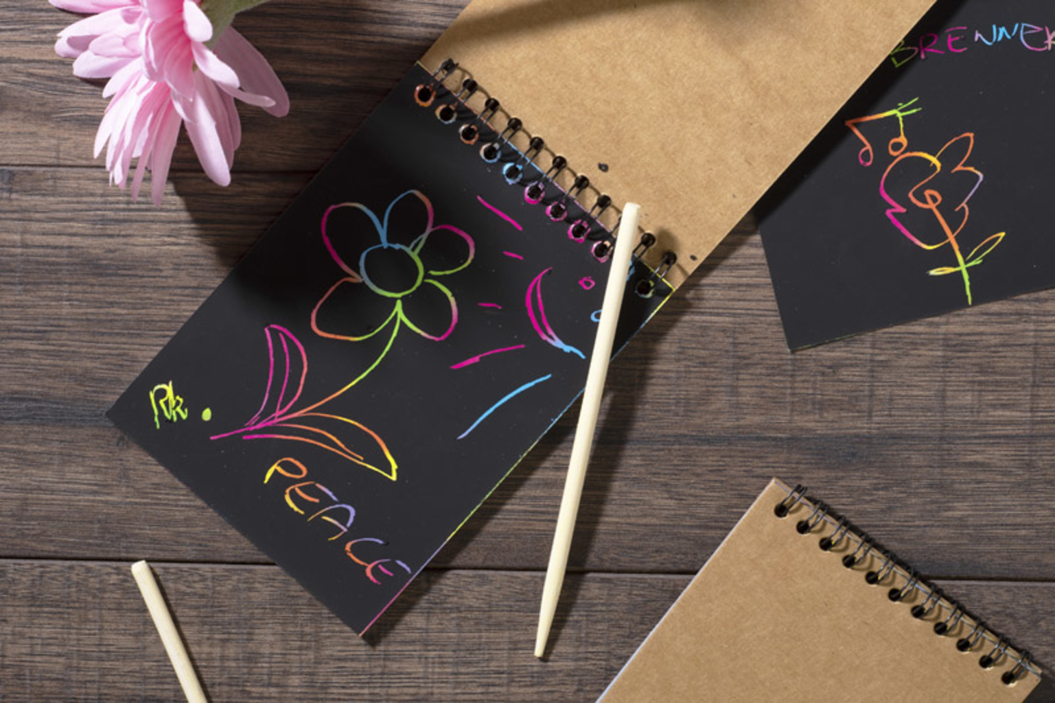 Neobvyklý zápisník s černými stíracími lištami. Bambusovou hůlkou můžete vytvořit barevný duhový obraz. To vám umožní rozvíjet svou vlastní představivost vytvořením vlastních kompozic.