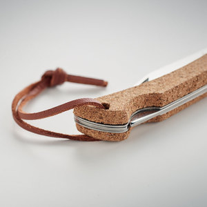 Zavírací nůž z nerezové oceli s korkem potaženou rukojetí a PU šňůrkou. Korek je přírodní materiál, vzhledem ke své struktuře a povrchové pórovitosti může být výsledek tisku na stejných předmětech rozdílný.