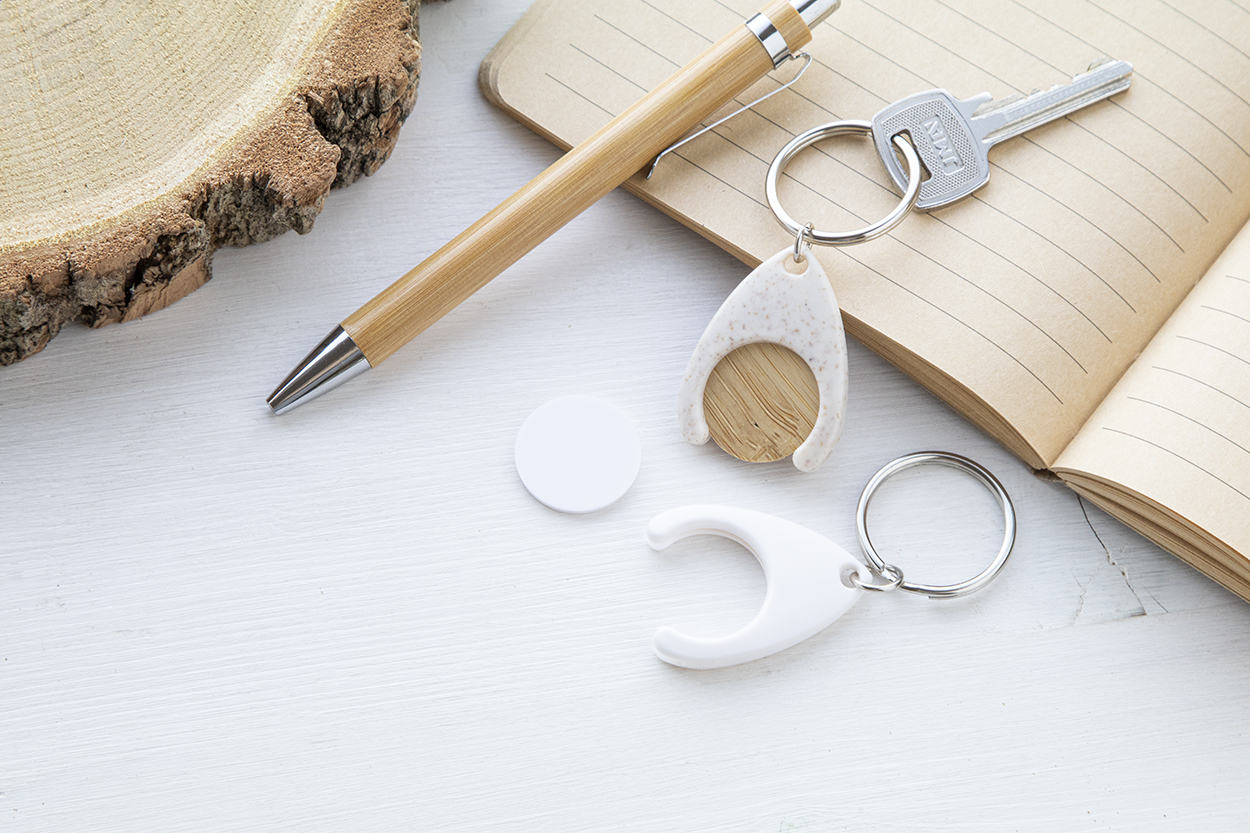 Bambusový žeton do nákupního vozíku v ekologické plastové klíčence z pšeničné slámy.