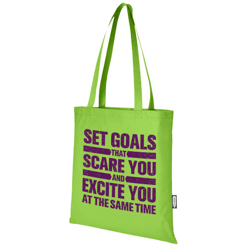 Recyklovaná velká nákupní taška Zeus GRS vyrobená z trvanlivého a proti roztržení odolného materiálu RPET je perfektní a udržitelnější variantou pro veletrhy nebo konference. Její tenký design z ní dělá elegantní model a tašku vhodnou pro přenášení lehkých předmětů, jako je notebook a pero. Ucha jsou dlouhá 29 cm, a proto se nákupní taška snadno přenáší přes rameno. Nosnost do 5 kg.