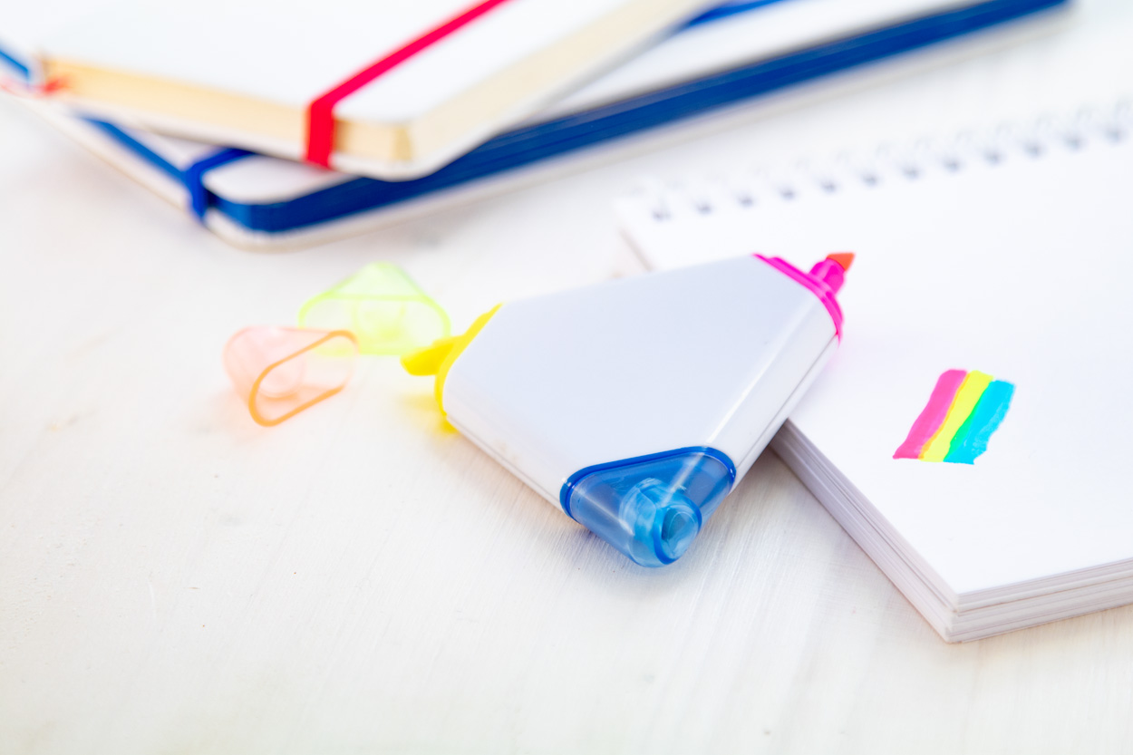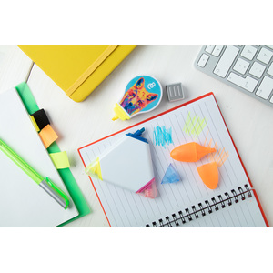 Zvýrazňovače ve tvaru trojúhelníku s 3 různými barvami a průhlednými kryty.